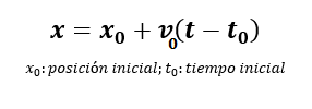 Para obtener esto, hemos partido de que la velocidad en un MRU es constante (y, por tanto, la aceleración es nula). Si despejamos en la ecuación que aparece a la derecha, obtenemos que la posición x del cuerpo en función del tiempo t viene dada por (y teniendo en cuenta que la velocidad es constante e igual a la inicial):