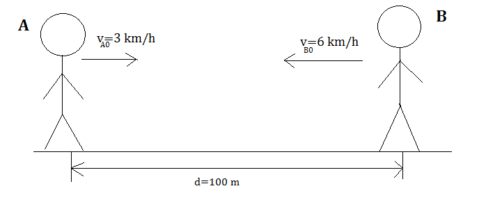Ejemplo 2: Dos personas se desplazan en la misma dirección y sentido contrario. La persona A se desplaza a 3 km/h mientras que la persona B se desplaza a 6 km/h, ambos a velocidad constante. Sabiendo que inicialmente se encuentran a 100 m, ¿en qué punto y en qué instante se encuentran las personas A y B?