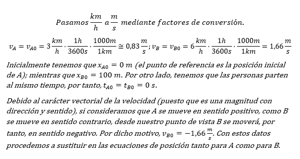 En primer lugar, debemos tomar un punto de referencia. Aquí, ese punto de referencia será la persona A, pero si el lector decide hacerlo tomando la persona B como referencia obtendrá el mismo instante (cuando se cruzan las personas) mientras que la posición que obtendrá será la distancia a la posición inicial de la persona B (con la referencia que tomaremos en la resolución, la posición obtenida será la distancia a la posición inicial de la persona A).