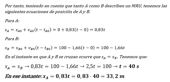 Solución: A y B se cruzan cuando han transcurrido 40 segundos y a una distancia de 33,2 metros de la posición inicial de A.