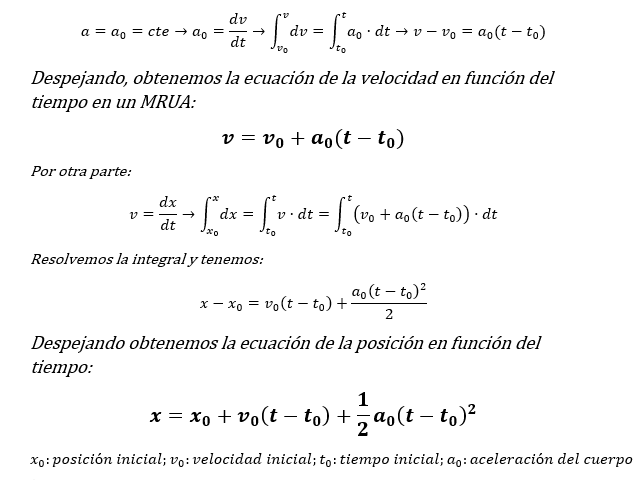 Es aquel que está sometido a una aceleración constante. Como volveremos a considerar que la línea recta que describen los cuerpos en este movimiento coincide con el eje x, obtendremos las siguientes ecuaciones para la posición y la velocidad de los cuerpos (he de volver a decir que si no has dado derivadas e integrales, sólo tengas en cuenta las expresiones finales que aparecen en negrita).