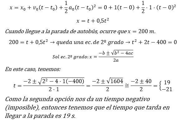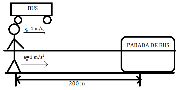 Ejemplo 3: Un hombre anda inicialmente a 1 m/s. En un instante, se percata que el autobús que desea coger se dirige hacia la parada que está a 200 metros del hombre. En ese momento, decide acelerar a un ritmo de 1 m/s en cada segundo. En esas condiciones y sabiendo que el autobús tardará 30 segundos en partir desde esa parada, determinar si el hombre coge finalmente ese autobús.