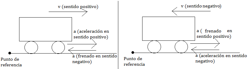 Aunque hasta ahora hemos tratado casos en los que la aceleración implicaba un aumento (constante porque tratamos únicamente movimientos uniformemente acelerados) de la velocidad; sin embargo, no hemos tenido en cuenta que la velocidad igual que aumenta se puede reducir (cuando frenamos). Por ejemplo, imaginemos estar quietos en un punto (nosotros somos el punto de referencia) y, en el punto que nos encontramos, pasa un coche que aumenta la velocidad (acelera), en ese caso consideramos la aceleración con signo positivo, pues acelera en el sentido que consideramos positivo; mientras que si el coche disminuye la velocidad (frena) lo hace en sentido contrario a la marcha que lleva el cuerpo, por tanto, en este caso, como nosotros somos el punto de referencia y consideramos que el sentido de la velocidad es positiva, el sentido de la aceleración será el contrario y consideraremos que el sentido de la aceleración es negativo. Sin embargo, si imaginamos otra situación distinta en la que somos el punto de referencia y un coche se nos acerca; por tanto, el sentido de la velocidad será negativo, mientras que si el coche acelera tendrá sentido negativo también y si frena tendrá sentido contrario (en este caso positivo). En resumen, si un cuerpo acelera (aumenta su velocidad) la aceleración tendrá el mismo signo que la velocidad, mientras que si frena, el cuerpo tendrá una aceleración con signo contrario al de la velocidad.