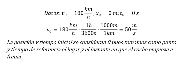 Ejemplo 4: Un coche circula a 180 km/h. En un instante, observa que hay un peatón situado a 200 m de distancia y empieza a frenar a un ritmo constante de 10 m/s en cada segundo. Determinar si el coche atropellará al peatón.