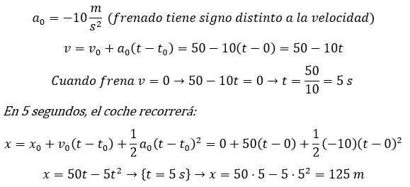 Solución: el coche recorrerá 125 m hasta que se detiene; como el peatón se encuentra a 200 m del lugar donde el coche empieza a frenar, tenemos que x=125 m<200 m, por tanto, (como podemos ver obviamente el coche se detiene antes de la posición donde está el peatón) el coche NO atropellará al peatón.