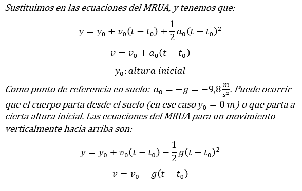 Hasta ahora, los ejemplos de MRUA que hemos visto han sido movmientos en ''horizontal'', o sea, hemos hablado del movimiento de personas o de coches (que obviamente se dan sobre el suelo). Sin embargo, no hemos tratado casos en los que los movimientos son verticales (en los que se atraviesa el aire). Aunque puede ubicarse el punto de referencia en la altura inicial del objeto u en otra altura de referencia (por ejemplo a la que se encuentre el observador), en esta entrada siempre ubicaremos el punto de referencia en el suelo. Por otra parte, debemos tener en cuenta la aceleración de la gravedad (que es la que hace que caigan los objetos al suelo) oscila entre 9,77 y 9,83 m/s en cada segundo dependiendo del punto de la Tierra donde nos encontremos; no obstante, lo trataremos siempre con un valor de 9,8 m/s en cada segundo (pues es una buena aproximación). Como el punto de referencia es el suelo y la aceleración de la gravedad hace que los cuerpos caigan hacia el mismo, desde nuestro punto de vista la aceleración de la gravedad tendrá signo negativo. En este tipo de movimientos, al ser perpendiculares a los que hemos tratado anteriormente, consideramos que el movimiento de los cuerpos tendrá lugar en el eje y.
