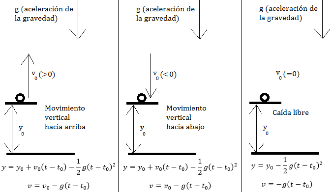 2. Movimiento vertical hacia abajo. Las ecuaciones son las mismas que en el caso de un movimiento vertical hacia arriba; la única diferencia es que (como nuestro punto de referencia es el suelo), la velocidad inicial tiene signo negativo (en el caso anterior el signo de la velocidad inicial es positivo). Otra diferencia es que para que se dé este movimiento es necesaria una altura inicial (mayor que 0)