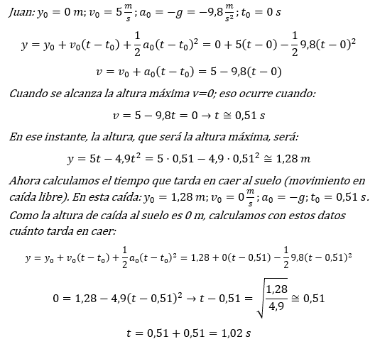Empecemos a analizar en qué situación se encuentran nuestros amigos. En primer lugar, Juan provoca un movimiento verticalmente hacia arriba. Si queremos saber cuándo llega la piedra al suelo, en primer lugar debemos calcular la altura máxima que alcanza la piedra, y después, hallar cuánto tarda la caída libre (desde esa altura máxima). Veámoslo: