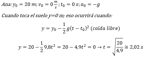 En segundo lugar veamos el caso de Ana. Su caso es un movimiento en caída libre con una altura inicial de 20 m.