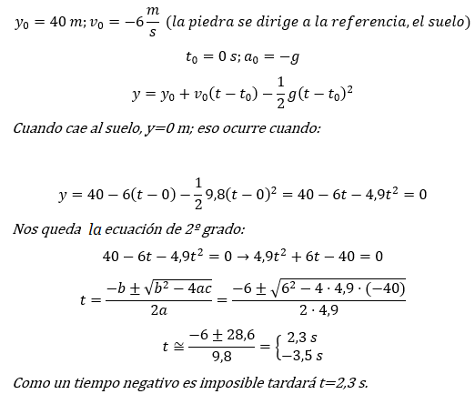 Por último, analicemos el caso de Sofía, quien lanza verticalmente hacia abajo una piedra con una velocidad inicial de 6 m/s a una altura de 40 m.