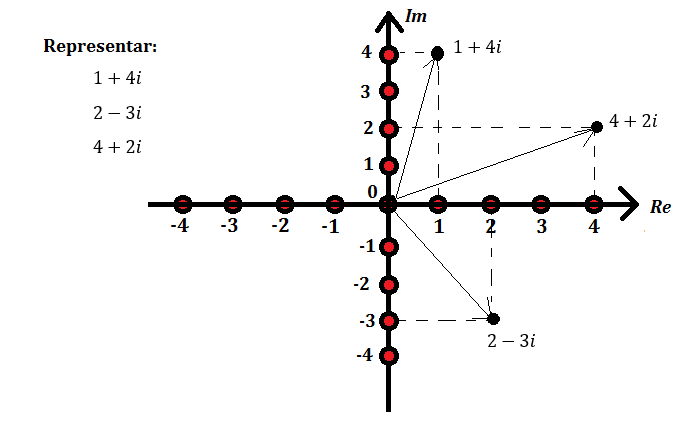 Con esto, representemos los 3 ejemplos de números complejos anteriores: